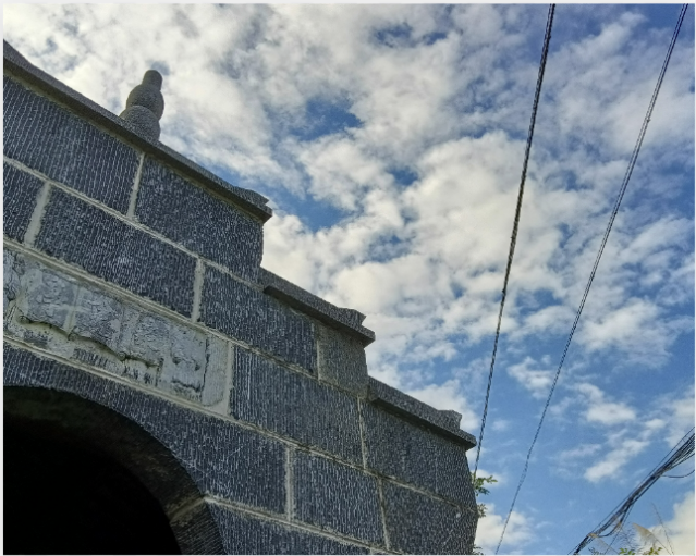 五里即一亭,许久,象兑亭出现在了眼前,灰蓝的砖石与蔚蓝的天空谱出了融洽的曲子,如观澜书院拱秀上的宝葫芦,兑象亭上的宝葫芦也寓意着吸取天地精华,铸就人杰地灵。尽管亭子已经不再是文人墨客歇脚的地方,但它也并未被荒废,而是成了当地人编织扫帚,种植农作物累了而休息的地方。