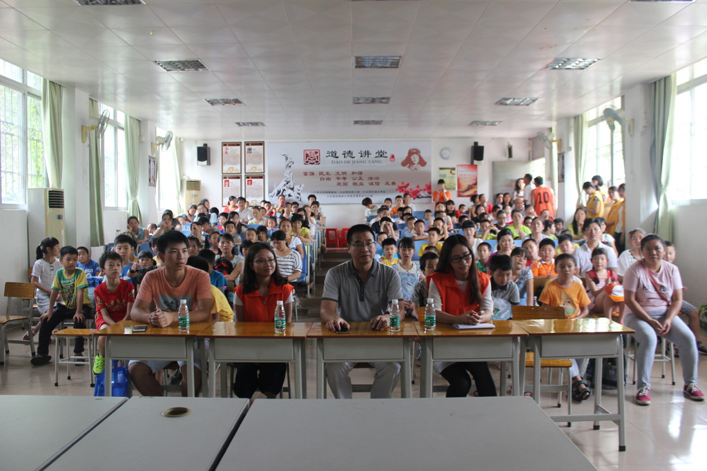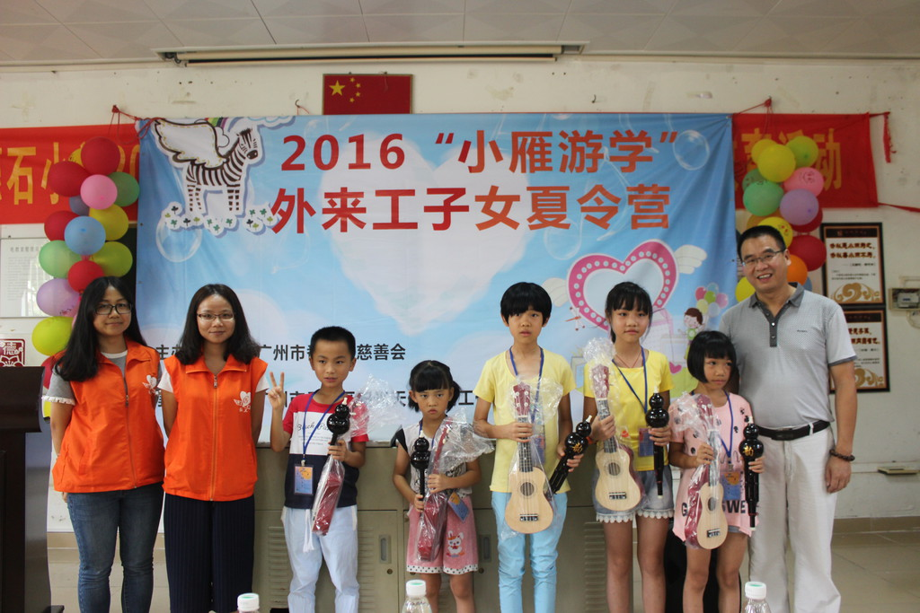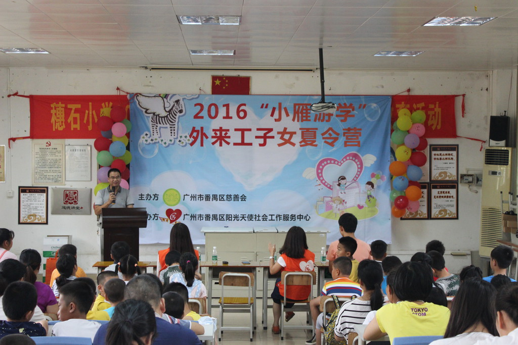 本网讯2016年8月1日上午九点三十分,“小雁游学”外来工子女夏令营开营仪式在穗石小学阶梯教室拉开序幕。本次夏令营主办单位为广州市番禺区慈善会,协办单位为广州市番禺区阳光天使社会工作服务中心。小谷围办事处梁科长,番禺区阳光天使社会工作服务中心主任区总,“阳光天使”服务队队长林海峰出席。另外“阳光天使”服务队志愿者们也参与了本次开幕仪式。