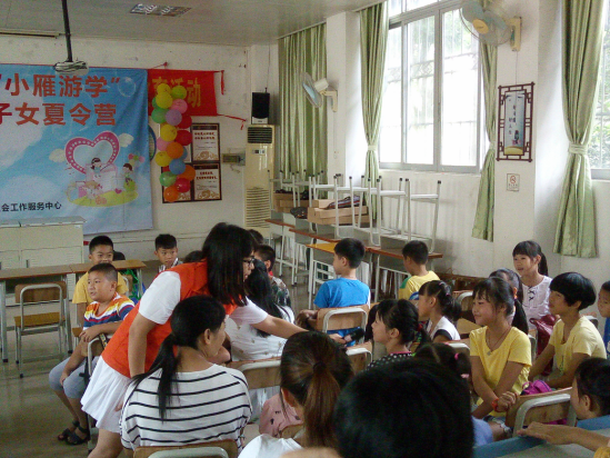 仪式开始前,社工与参加本次夏令营的孩子们玩起“向左向右看”以及“传小球”的游戏,现场气氛一片活跃,大部分孩子都积极融入到愉快的游戏氛围中。