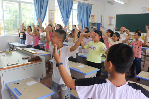 接下来是手语操课。为了将广外特色带入校园,我们特地挑选了大一军训时所学的手语操《我真的很不错》,同时也希望这首歌能增强同学们的自信心,在接下来的学习中也积极表现自己。一开始我们播放教学视频,很多同学都情不自禁地跟唱以及跟做手语动作。然后主讲教师逐句教唱,同学们逐句跟唱,旋律从生硬变得流畅,童声中充满了天真。在手语动作的教学中,三位教师齐上阵,仅仅教了两遍,许多同学都已经能完整的做出来,果然,小朋友们的学习能力是远超过我们的。