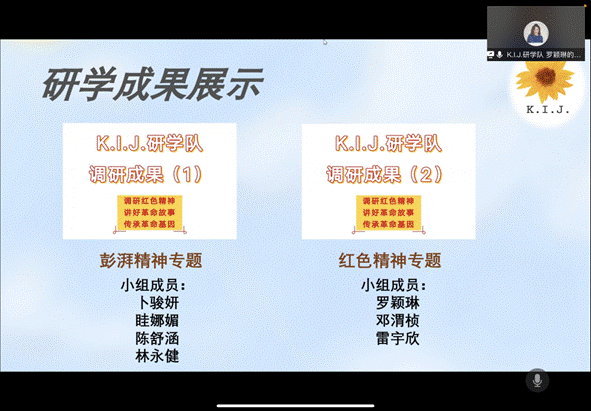 至此,K.I.J.研学队“三下乡”线上调研成果展示会正式结束,这次展示会也为本次的研学活动画上圆满的句号。K.I.J.研学队15名队员在调研中积极展示团队风采、展示会院学子风采,在研学活动中承担了青年所应承担的使命和责任,积极研究以彭湃精神为代表的红色精神的传播方式与传承效果,探究如何更好地传播红色精神,让红色文化内化于心,外化于行。此次研学使队员们不仅在个人能力上有所长进,也在思想上有所进步,实现了调研能力的提升。