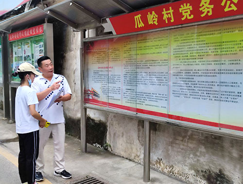 (村支书向队员介绍党务公开栏 骆颖颖摄)