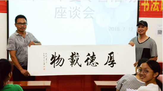 座谈会上,曹钟兴先生分享了自己宝贵的人生经历,鼓励同学们定下目标并为之付诸努力,勇于直面困难并克服它,也强调了年轻时的磨练对人生的重要性,并对下乡活动做出重要指示,肯定了队员们的下乡成果,鼓励队员和同学们继续努力。接着是卢树声先生致辞,以“世界因我而更美丽,人们因我而更快乐”作为人生追求,以“做个有梦想的人”为主题,肯定了云潭一中的发展,并鼓舞在座的老师同学们尽己所能为云潭尽一份力。同时,李树协校长总结了曹钟兴先生和卢树声先生的讲话,要求同学们从曹会长与卢总监分享的人生经验中吸收养分,努力培养高尚的人格与品质,要在正确的时间做正确的事情,勇于树立远大理想。致辞后,曹钟兴先生将自己珍藏多年的书法作品“厚德载物”赠与云潭一中,可见对云潭一中与Sum.mer服务队的大力支持以及对本次夏令营活动的肯定。