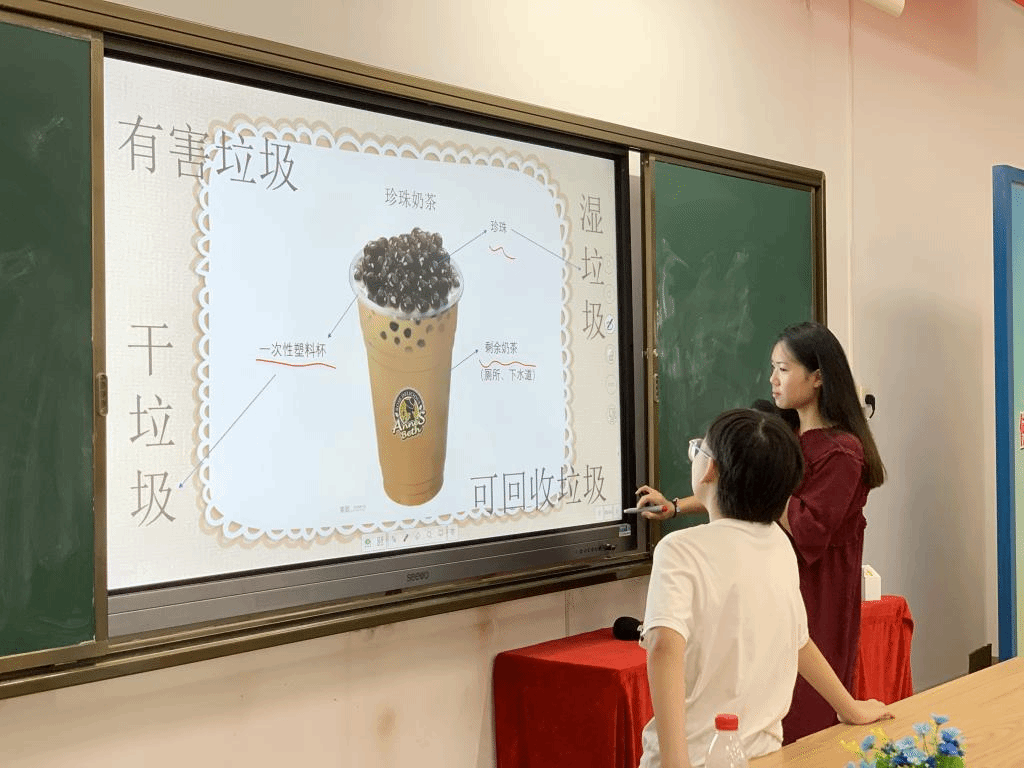 上午9点,小朋友们准时就座准备上第一节课——“垃圾分类”。苗非凡老师先以上海为基础讲解了垃圾分类重要意义和繁杂细致的规则,后以珍珠奶茶为具体例子,生动有趣地讲述了干湿垃圾的范畴,教导了小朋友们怎么实行垃圾分类,令小朋友们大开眼界。