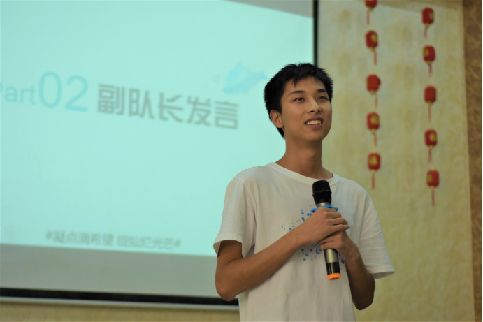 “凝光”三下乡服务队副队长钟儒康也在发言中衷心地感谢全体教师学员的坚持和配合。他说:“学生们在课堂上积极举手,跟着老师的思维走,配合老师工作,给我们工作减少了很大的负担。同时,在这短暂的两个星期里,如果我们让你们学到了一点点东西,我们就已经心满意足了!我们也希望,这两个星期,能够成为你们以后一段美好的回忆!”