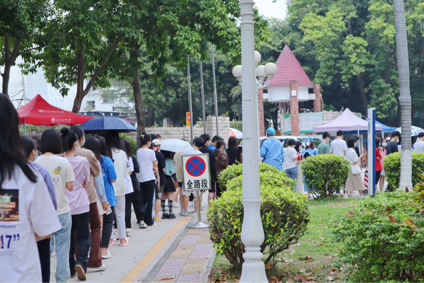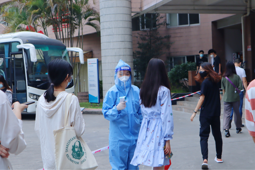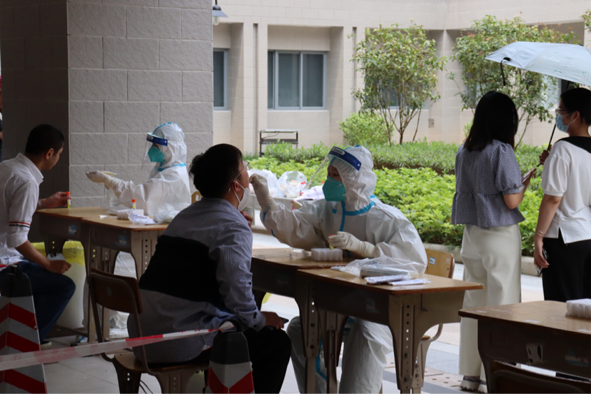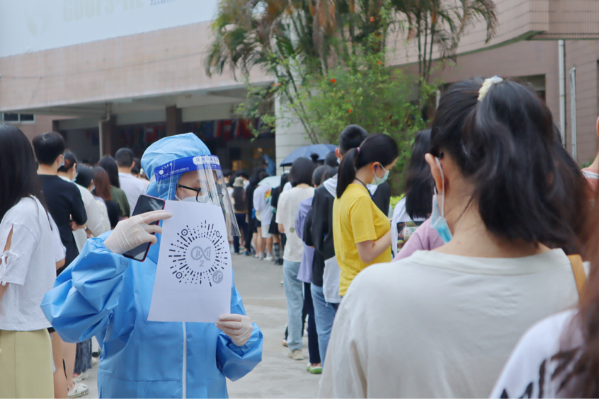 广州的春日已经逐渐炎热,身穿防护服的志愿者和医护人员滴汗如雨却毫无怨言,一次次重复着引导队伍、指引扫码、确认信息、核酸检测的动作。繁重的任务,尽职尽责的态度,只为守护广外,为核酸检测工作保驾护航。