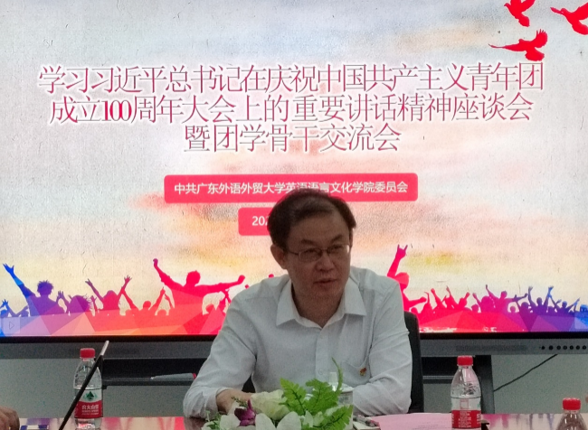 王则唐强调,习近平总书记在庆祝中国共产主义青年团成立100周年大会上发表的重要讲话,充分体现了习近平总书记和党中央对新时代中国青年的热情勉励和为深切关怀,充分彰显了我们党对青年的真挚关心和深厚期望,感人至深、催人奋进。王则唐传达了校党委书记、校长石佑启对广大广外青年提出的四点期望:一是牢记习近平总书记嘱托,做赤诚报国的有志青年;二是擦亮青春底色,做崇德修身的有德青年;三是担当时代使命,做奋发进取的有为青年;四是勇于创新突破,做本领过硬的有才青年。围绕深入学习贯彻习近平总书记重要讲话精神,王则唐对英文学子特别是团学干部提出三点要求和希望:一是胸怀家国,明确奋斗目标。当前,百年变局和世纪疫情交织,经济全球化遭遇逆流,世界进入新的动荡变革期。英文学子要牢记习近平总书记“外语院校大有可为”的殷殷嘱托,善于从政治看问题,胸怀大局,把握大势,着眼大事,奋进新征程,建功新时代,努力成为有家国情怀、有全球视野、有专业本领的复合型人才,在推动中国更好走向世界,世界更好了解中国上作出新的贡献。二是准确定位,服务青年学生。团学组织要按照习近平总书记指示,同广大青年打成一片,做青年友,不做青年“官”,多为青年计,少为自己谋,努力加强自身建设,充分发挥桥梁纽带作用,服务要下沉,“末梢”要激活,加强与每个班级、每位团员青年的联系,千方百计为青年办实事、解难事,主动想青年之所想、急青年之所急,为青年提供实实在在的帮助。尤其是,团学组织和团学干部要积极主动热情参与疫情防控工作,特别关注疫情防控常态化背景下同学们的学业、毕业和就业等问题。三是锤炼自我,增强素质能力。英文学子尤其是团学干部,要深刻领会习近平总书记对共青团员提出的“五个模范、五个带头”的成长指引,成为具有家国情怀、国际视野、法治信仰、理性思维、实干精神、健康身心的高素质复合型外语人才,充分展现出新时代中国青年应有的好样子。最后,王则唐希望英文学子胸怀崇高理想,恪守学生本分,坚持读书明理、学习明志、思考明辨,做一个高尚的人、一个纯粹的人、一个有道德的人、一个脱离了低级趣味的人,一个有益于人民的人、一个堪当大任的新时代中国青年!