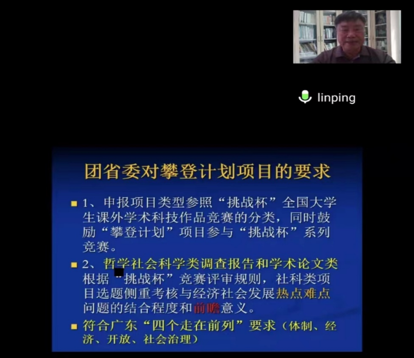 本网讯 10月20日下午,由校团委主办、校学生会承办的攀登大讲堂在线上圆满举办。本次攀登大讲堂邀请到了原广东省社会科学院企业研究所所长、“挑战杯”系列赛事省赛与国赛资深评委林平凡老师为广外学子们带来了“从挑战杯竞赛视角谈大学生课外社会科学调查实践方法和路径——从开始到撰写研究报告”的专题学术指导。讲座前期吸引了400多名同学前来线上报名。