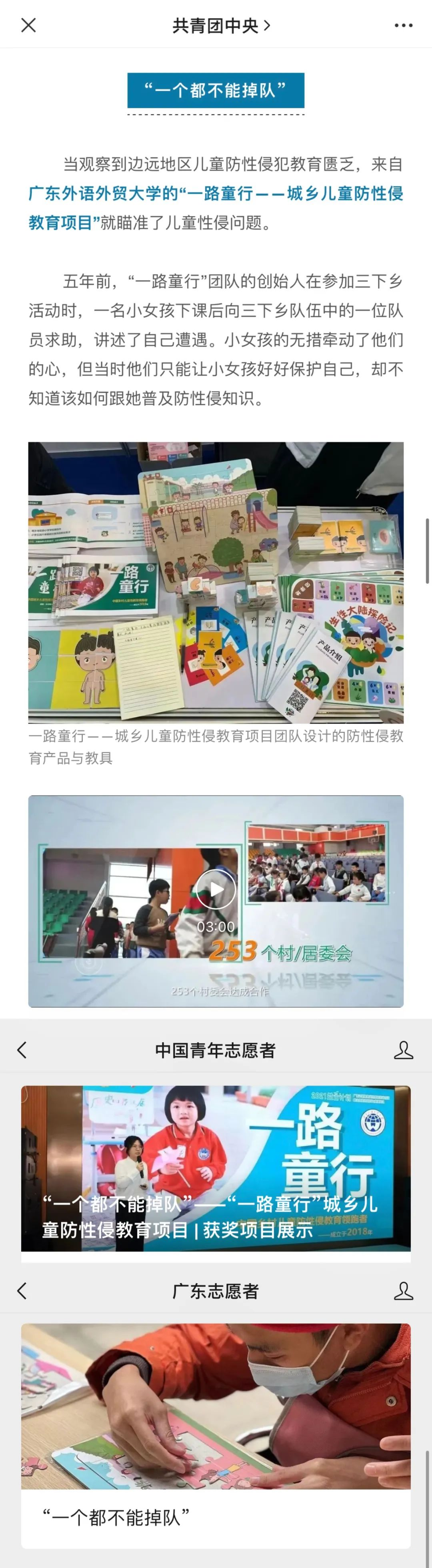 获奖团队“一路童行”团队事迹获得共青团中央、中国青年志愿者、广东志愿者等官方微信平台报道