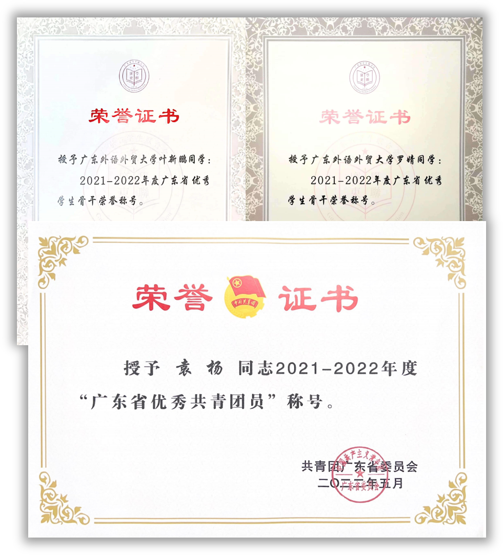 学生荣获“广东省优秀共青团员”及“广东省优秀学生骨干”荣誉称号