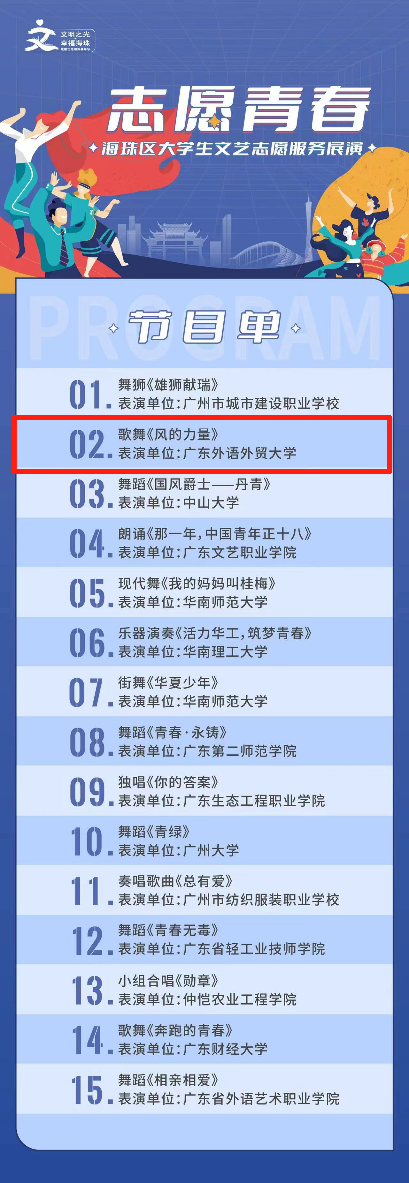 广外学生艺术团倾情演唱《风的力量》,同时借助歌舞表演,大力弘扬奉献、友爱、互助、进步的志愿精神,展现志愿青年的精彩面貌。