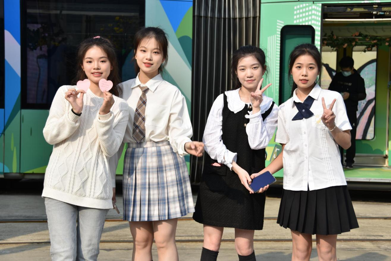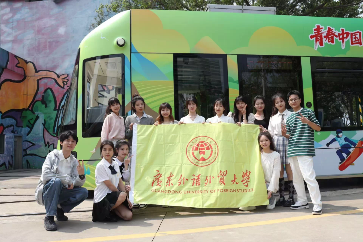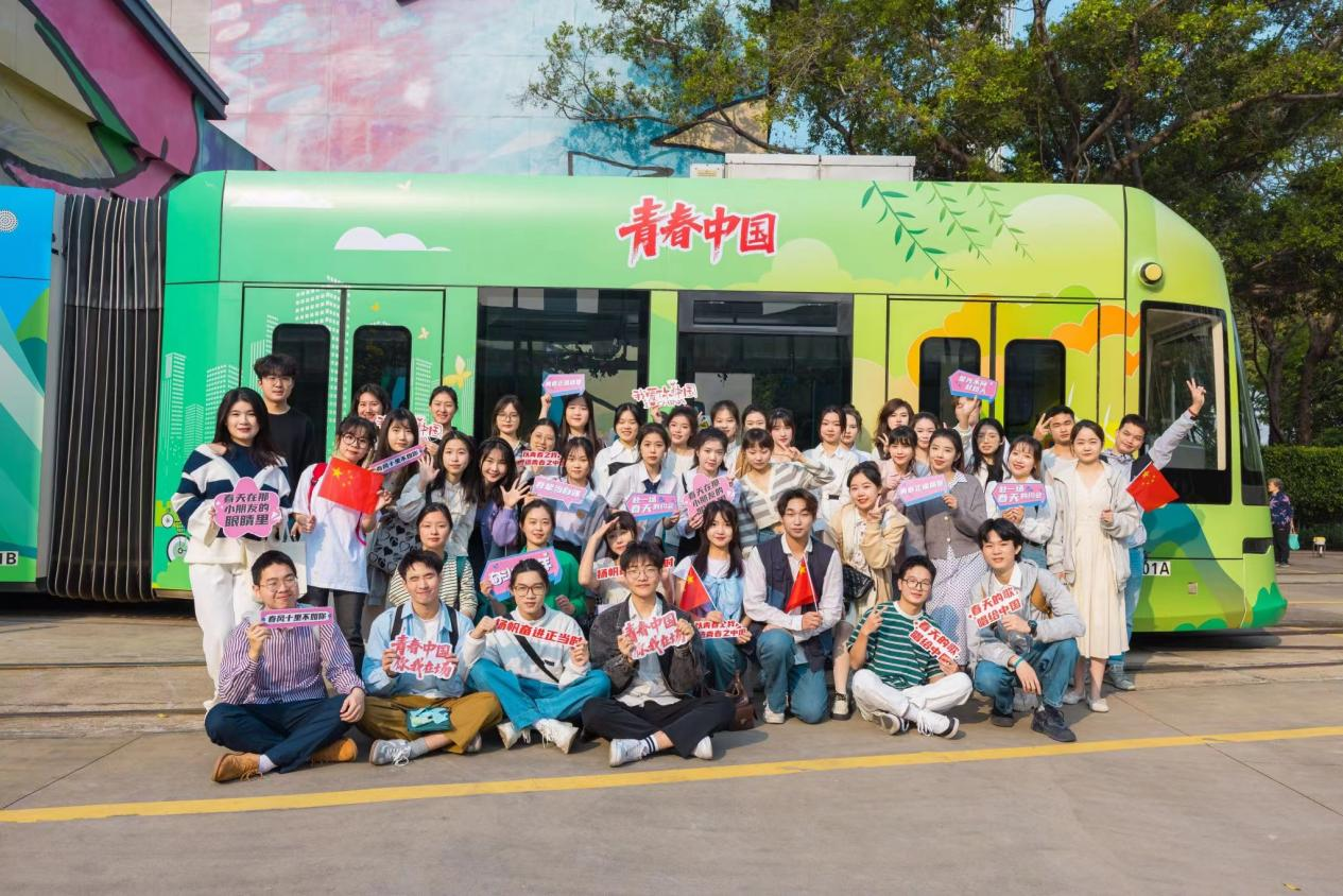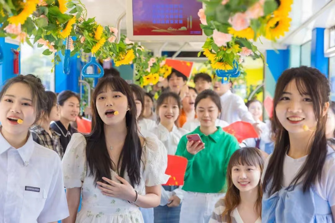 在“青春号”有轨列车上,乘客们被热情活泼的广外学子带动着一起欢唱歌曲,列车上洋溢着青春向上的气氛。