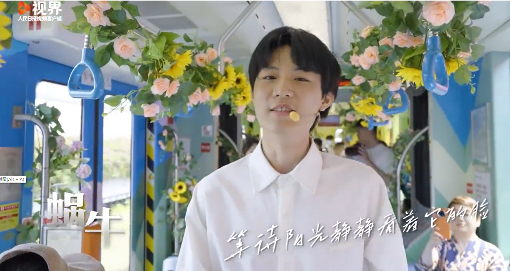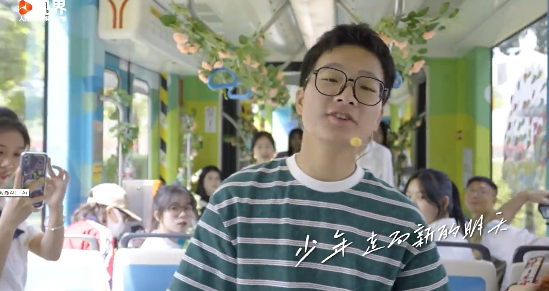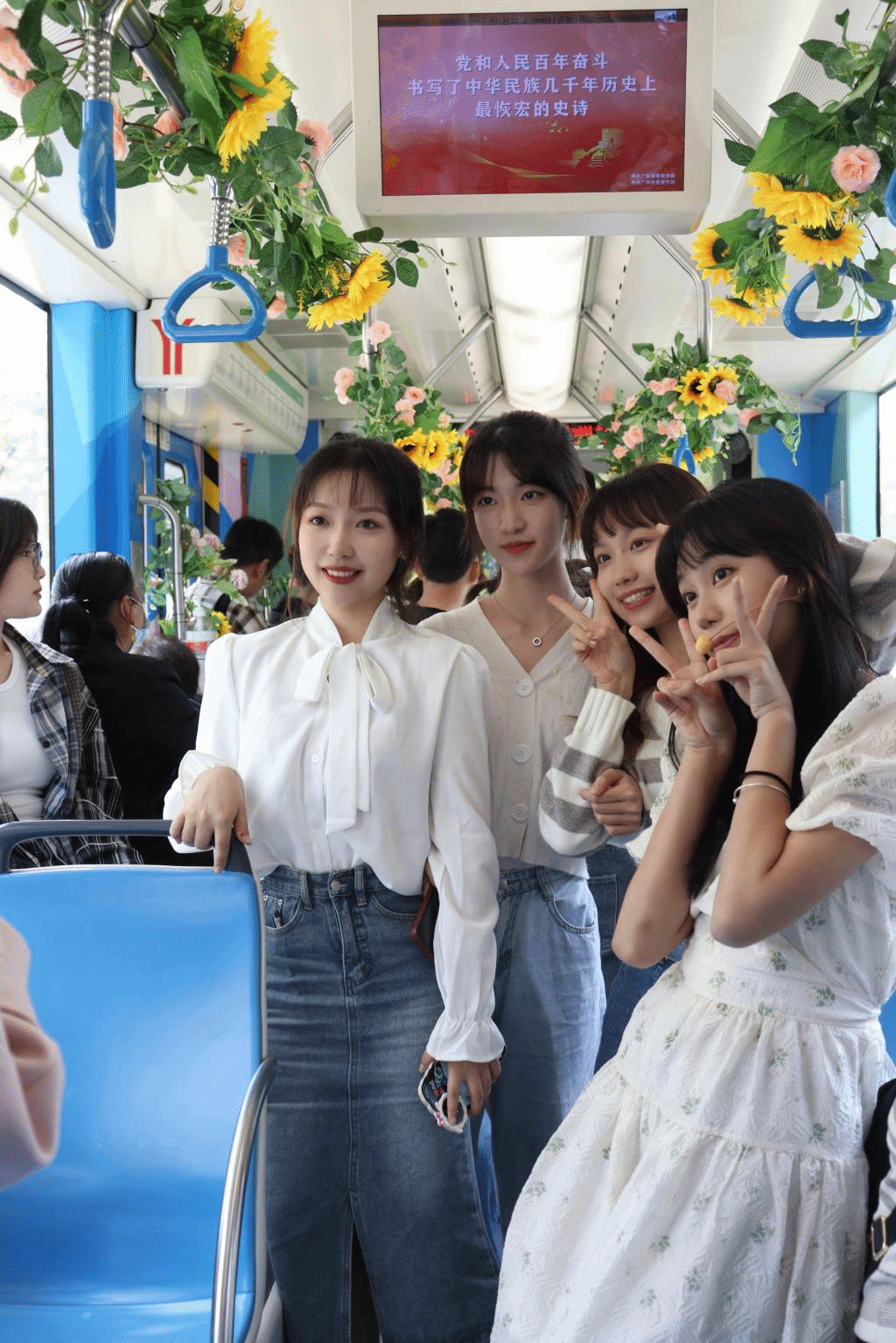 在“青春号”有轨列车上,乘客们被热情活泼的广外学子带动着一起欢唱歌曲,列车上洋溢着青春向上的气氛。