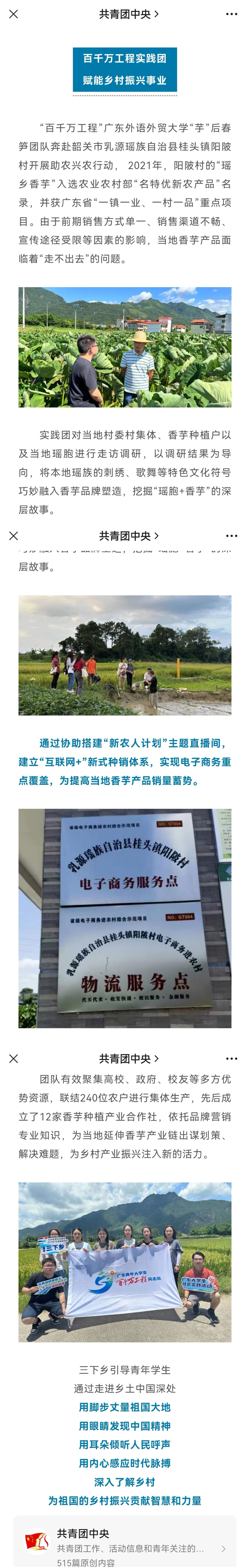 2021年,阳陂村的“瑶乡香芋”入选农业农村部“名特优新农产品”名录,并获广东省“一镇一业、一村一品”重点项目。团队充分运用当地香芋产品优势,有效聚集高校、政府、校友等多方优势资源,联结240位农户进行集体生产,先后成立了12家香芋种植产业合作社,依托品牌营销专业知识,为当地延伸香芋产业链出谋划策、解决难题。助瑶织梦,强业兴农。“芋”后春笋实践团将持续推进阳陂香芋电商直播、线上平台等“互联网+”式种销体系的建立与畅通,用实际行动书写赋能乡村振兴的青春故事!