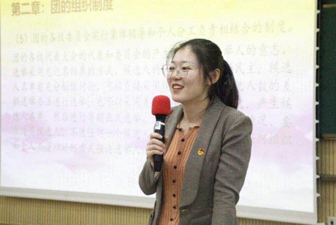 王毅昂兼职副书记和李新璐老师分别对团章内容进行解读,从团员的义务、团的组织制度等方面启发与会的团支书们,并明确了三个意识。一是政治意识,团员应明确党的性质、宗旨、历史使命、纲领,自觉增强对党的任务的认识。二是组织意识,作为团员要努力为社会作出贡献,厚植忠于组织的认同感和归属感。三是模范意识,团员要全方面发挥优秀榜样的作用。