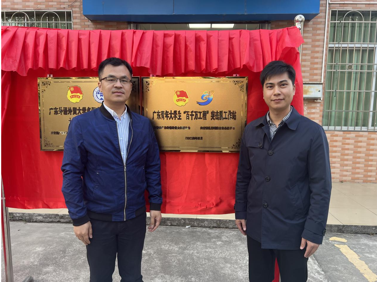 校团委刘郎书记与乳源瑶族自治县团委蒋锐书记在牌匾前合影留念