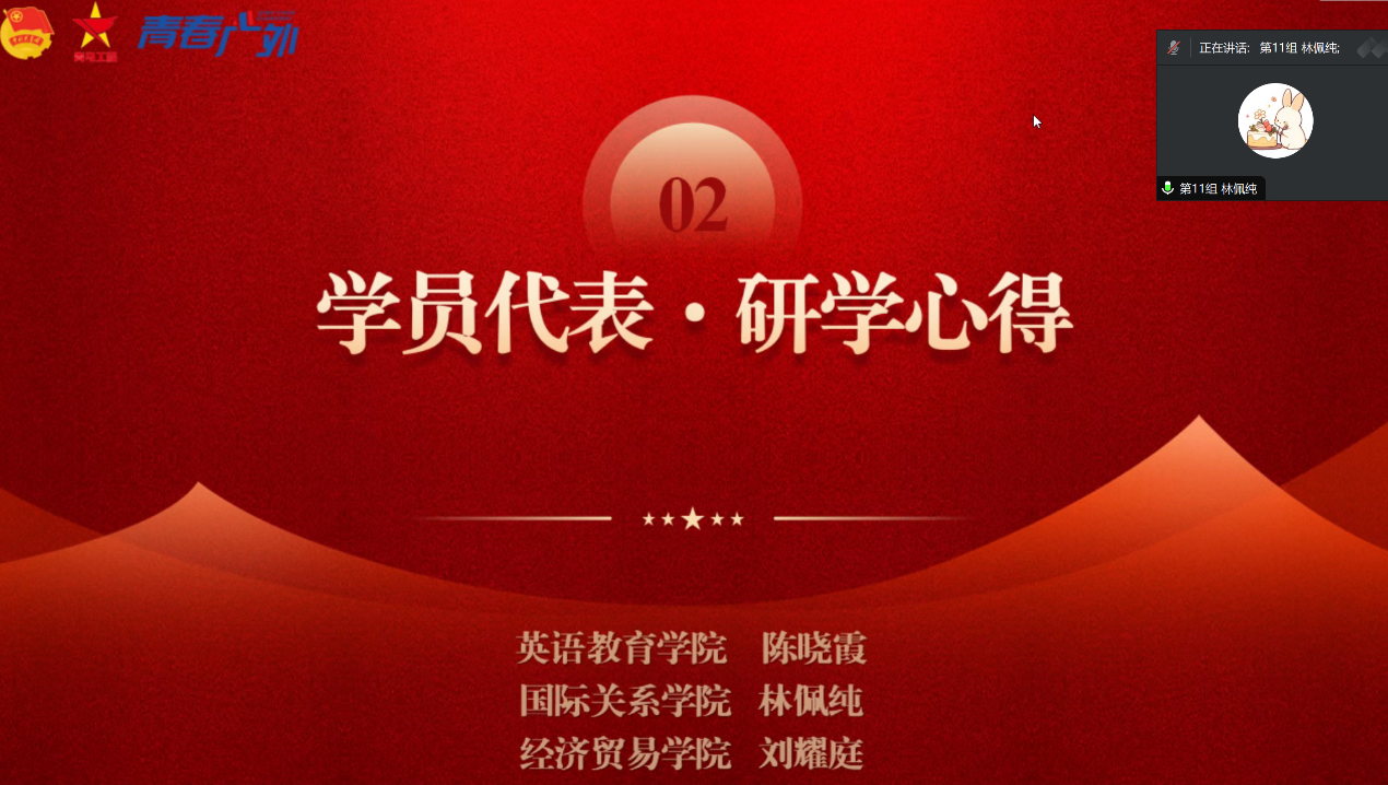 本网讯 为深入学习贯彻习近平总书记在党的二十届三中全会上的重要讲话精神和全会精神,帮助同学们加深对党的创新理论的理解,坚定将个人成才与国家发展相结合的信念,广外校青马班与省青马班的两位优秀学员共同进行一场集体学习。会议由骨干领学、学员分享和朋辈交流三个部分构成,校团委学生副书记陈慧珊主持会议,省青马班学员张祺彬、倪皓暄和校青马班全体学员参与学习。