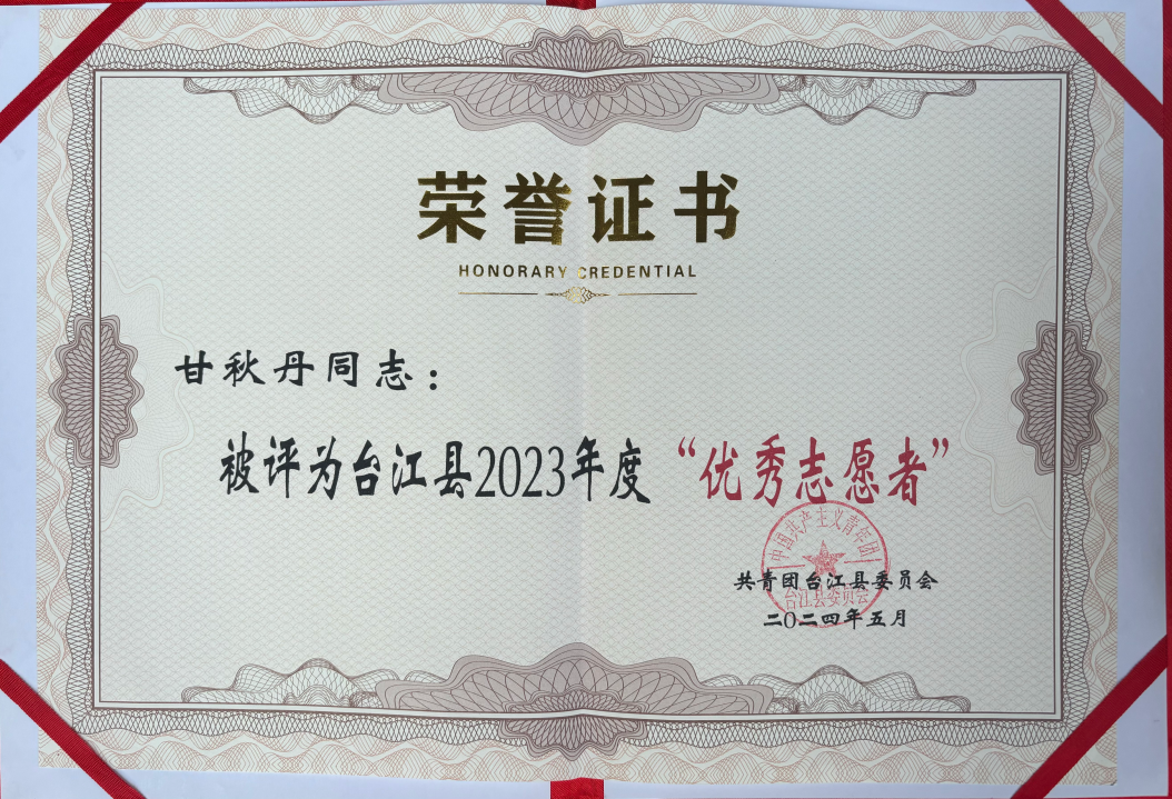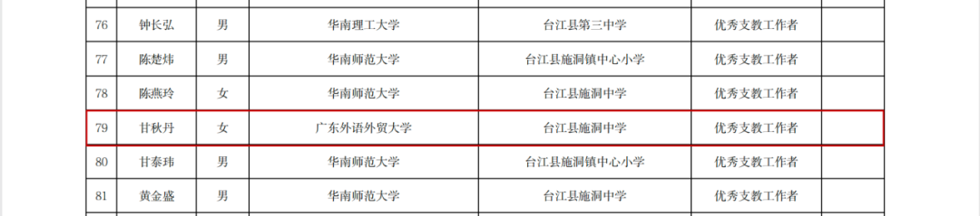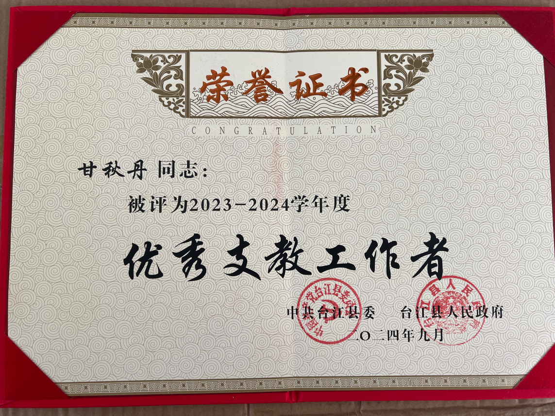 2023年7月,甘秋丹作为广外第九届研究生支教团成员服务于贵州省黔东南州苗族侗族自治州台江县施洞镇中学。服务期间她担任施洞中学三个班级的政治老师和其中一个班级的班主任工作;一年来,她以出色的教学、管理能力获得了学校领导老师、家长、同学们的一致认可,相关事迹被广东省教育厅、贵州省教育厅等多平台报道宣传。