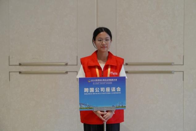 商英学院的邱蔓在此次活动中担任会务指引的志愿者,能够参与2024粤港澳大湾区全球招商大会的志愿服务,她感到无比荣幸。在志愿服务过程中,她遇到不少外国嘉宾来询问,能运用英语专业知识为其解答和指引,让她在帮助他人的同时收获了成就感与幸福感。“特别幸运的是,作为‘湾区之夜’小组的一员,我见证了来自世界各地的嘉宾交流合作,开拓了视野,让我对充满无限可能的未来更加憧憬。感谢学校提供的这个机会,这次志愿经历不仅丰富了我的人生经验,还让我见识到更广阔的世界。”