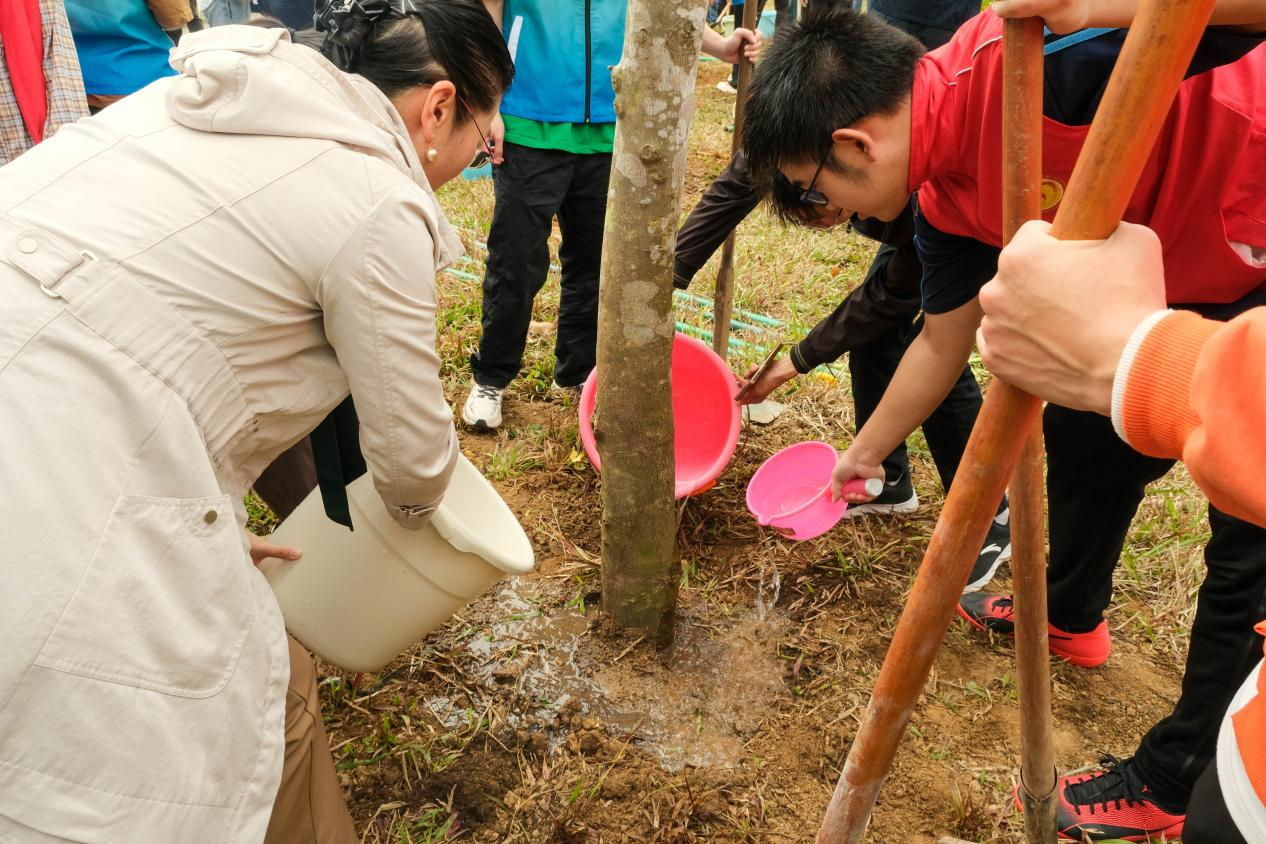 绿美广东,青春广外。活动现场,广外师生热情高涨,协作默契,他们挥锄铲土、扶苗培根、浇水灌溉,全心投入到植树护绿的行动中。在广外师生的共同努力下,一株株新栽的树苗昂然挺立,为校园增添了一抹生机勃勃的新绿,注入了新的活力与希望。活动尾声,师生们与种下的树苗合影留念,在青年林纪念树牌上写上自己的名字,共同见证绿色希望的萌发。