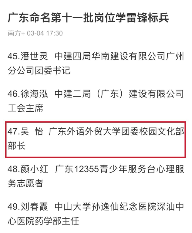 本网讯 在2025年“3·5”学雷锋纪念日到来之际,中共广东省委宣传部命名了第十一批广东省岗位学雷锋标兵,58个标兵集体和54名标兵个人获得殊荣。伟德国际1946团委干部、伟德国际1946,Bevictor伟德,伟德官网,伟德网页版书记吴怡同志荣获“广东省岗位学雷锋标兵”称号。