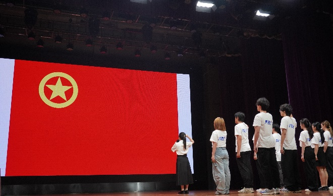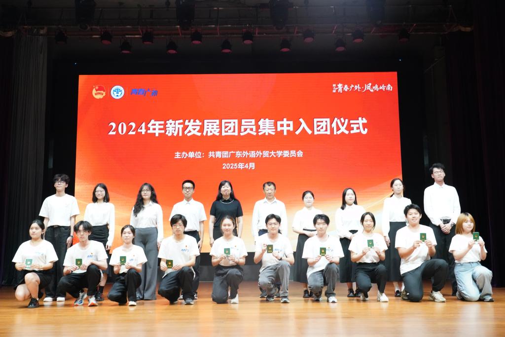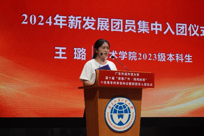 在新团员入团仪式中,校党委葛小月副书记、校党委原副书记许国彬教授和学生党员代表为新团员颁发团员证和团徽。商学院黄冰同学、艺术学院王璐同学作为新老团员代表,在仪式上发言。黄冰同学带领全体新团员在团旗下光荣宣誓。