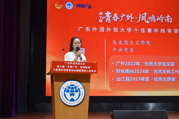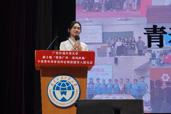 葛小月副书记代表大学向参加“十佳青年”风采展示和新入团的同学表示热烈祝贺。她书指出,以讲述身边青年典型和吸收新鲜力量的方式迎接五四青年节的到来,恰逢其时、意义非凡,青年一代应紧跟党的步伐,牢记习近平总书记“争做有理想、敢担当、能吃苦、肯奋斗的新时代好青年”的嘱托 。最后,葛书记寄语全体广外青年,在青春的征程上主动出击,踏出坚实的步伐,追逐出繁花似锦的未来。