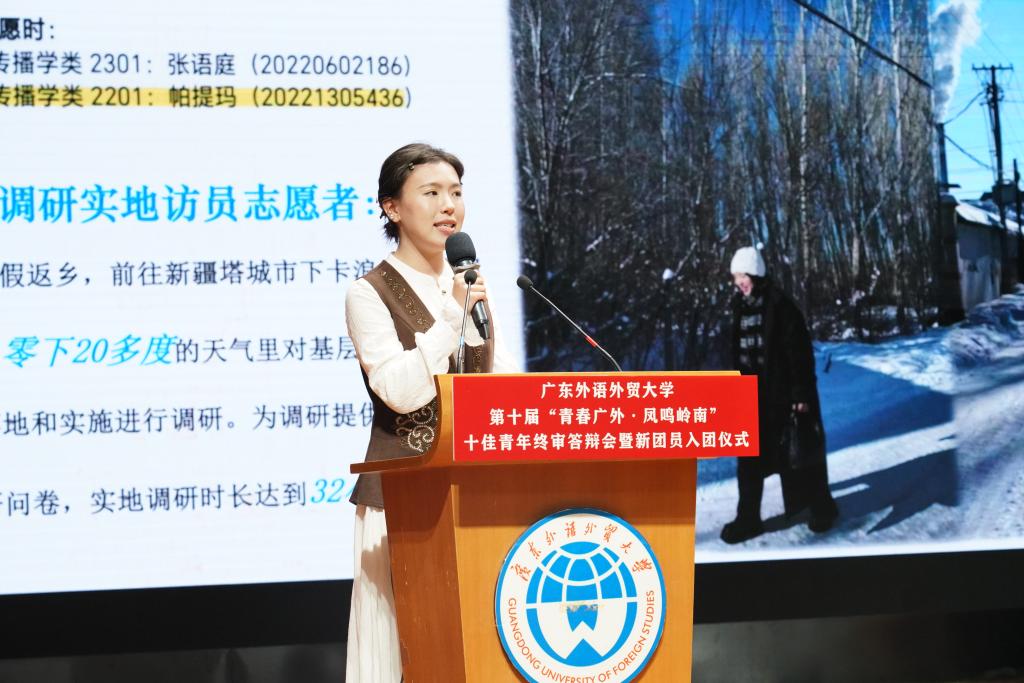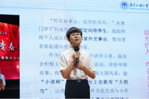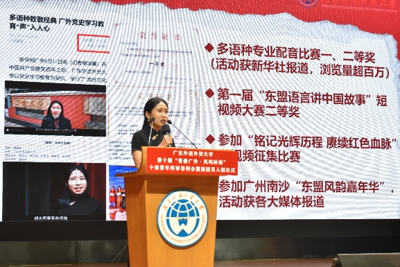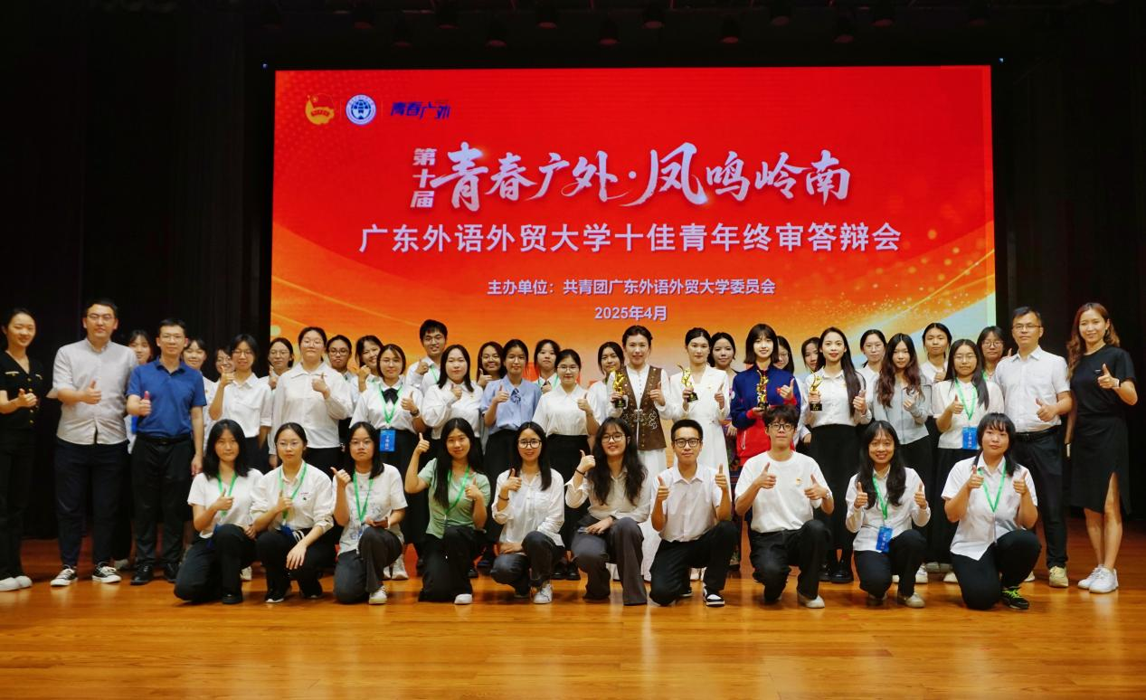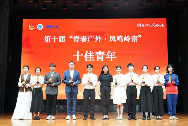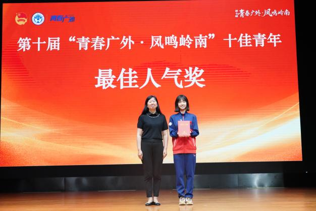 经贸学院彭子茵、商英学院胡秋琳、西语学院麦文疑、东南亚学院唐艺、中文学院谭秀薇、信息学院王俊朗、信息学院陈卓玮、翻译学院黄栋樑、马院甘秋丹、新闻学院帕提玛·卡汉荣获“十佳青年”称号,经贸学院彭子茵、新闻学院帕提玛·卡汉、信息学院王俊朗荣膺“最佳风采奖”,彭子茵同时获得“最佳人气奖”。校党委葛小月副书记为获奖学生颁奖。