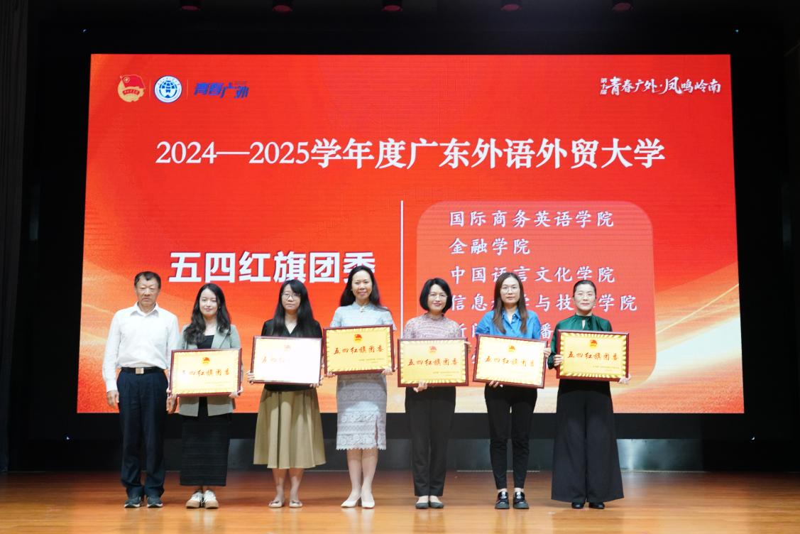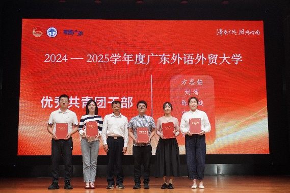 活动现场还颁发了2024-2025学年度五四红旗团委及2024-2025学年度优秀共青团干部奖项。许国彬书记为商英学院、金融学院、中文学院、信息学院、新闻学院、数统学院颁发五四红旗团委荣誉牌匾,为方思懿老师、刘洁老师、陈泠璇老师、宋鹏飞老师、李媛老师、刘天阳老师颁发优秀共青团干部证书。