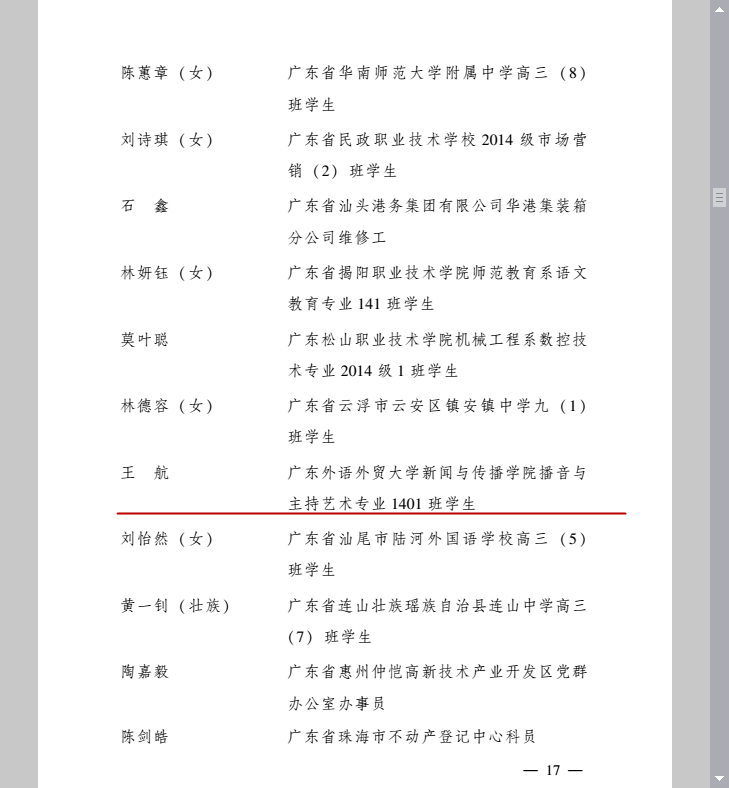 王航就读于伟德国际1946新闻与传播学院播主1401班,现担任校艺术团副团长。学业上,他曾以绩点全班第一的成绩结业,也凭全院综测第一的成绩获得“国家奖学金”。赛场上,他曾斩获“广东省大学生主持人大赛”专业组冠军、“南粤长城杯大中学生电视演讲比赛”特等奖、“海峡两岸电视主持新人大赛”金奖等奖项。曾获评2015-2016年度广东省优秀共青团员,2016年荣获本科生最高荣誉“校长奖章”。5月4日,他荣获“凤鸣岭南十佳青年”荣誉称号。