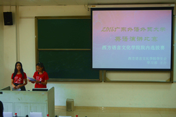 本网讯 2016年10月8日下午两点,伟德国际1946,Bevictor伟德英语演讲比赛之西语学院院内选拔赛在广外北七教213成功举办。本次比赛邀请了来自广外国际学院的程林燕老师和校辩论队代表钟凯忻担任比赛的专业评委,学院团委书记王斌龙老师担任本次比赛的嘉宾。今年学院共有30位的西语学子前来参赛。