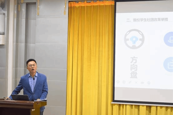 刘海春介绍了社团改革的背景和重要意义,指出学生社团是学生成长成才的重要渠道,是校园文化建设的重要载体。学校党委高度重视学生社团工作,将学生社团工作纳入学校思想政治工作和群团工作整体格局进行谋划部署,明确构建了由学校党委统一领导,学生工作部牵头负责,校团委具体指导,业务指导单位承担主体责任的管理机制。学校将会加大力度继续全面深化学生社团改革,加强政治引领,充分发挥其育人功能,落实立德树人的根本任务,真正做到为党育人,为国育才。