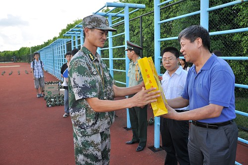 最后,刘祎和董俊武分别给营长以及学生代表送上慰问品,祝愿他们在接下来的军训生活中,笑傲困难,圆满顺利地完成大学军训。