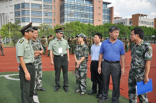 本网讯:9月13日下午,我院党委书记刘祎、副院长董俊武、党委副书记朱珍葶一行在军训旅副政委周知、副参谋长邹春权的带领下,看望并慰问了军训带训的教官以及2010级新生,受到了教官以及学生的热烈欢迎。随行的还有新生辅导员余海波、刘富先。