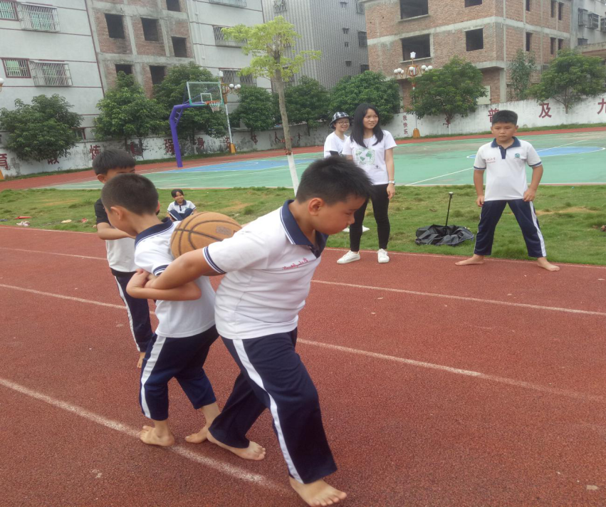 上午的趣味运动会游戏丰富多样。主要参赛人员是葵坑小学的三、四、五年级的学生,比赛的工作人员就是环协的所有三下乡成员,运动会比赛地点是在篮球场、羽毛球场和跑道上,比赛项目总共有五项,包括乒乓球接力、投篮、穿过呼啦圈(呼啦圈接力)、障碍物接力和背对背拥抱。