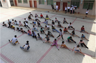 炎炎夏日抵挡不住孩子们奔向操场的热情,学生们整齐地站好队列,学着伟煦老师的动作活动筋骨,热身过后,大家选择自己所喜爱的活动分批锻炼。女生们在教学楼下的空地欢快地踢毽子、跳大绳,男生们则在篮球场进行激烈的友谊赛。学生们矫健的身影展现青春的活力,灿烂的笑容映着永恒的纯真,老师们深受气氛感染,纷纷加入游戏的行列。