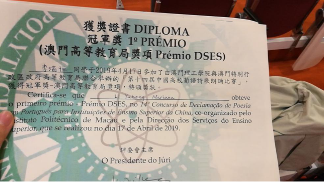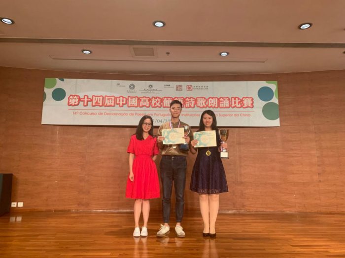 “中国高校葡语诗歌朗诵比赛”每年举办一届,是面向中国大陆及澳门地区葡萄牙语本科学生的专业赛事。经过与来自包括澳门大学,澳门理工学院,圣若泽学院,澳门科技大学,对外经贸大学,湖北大学,中山大学,北师大珠海分校共8所高校的24名选手的激烈角逐,伟德国际1946学子再创佳绩。