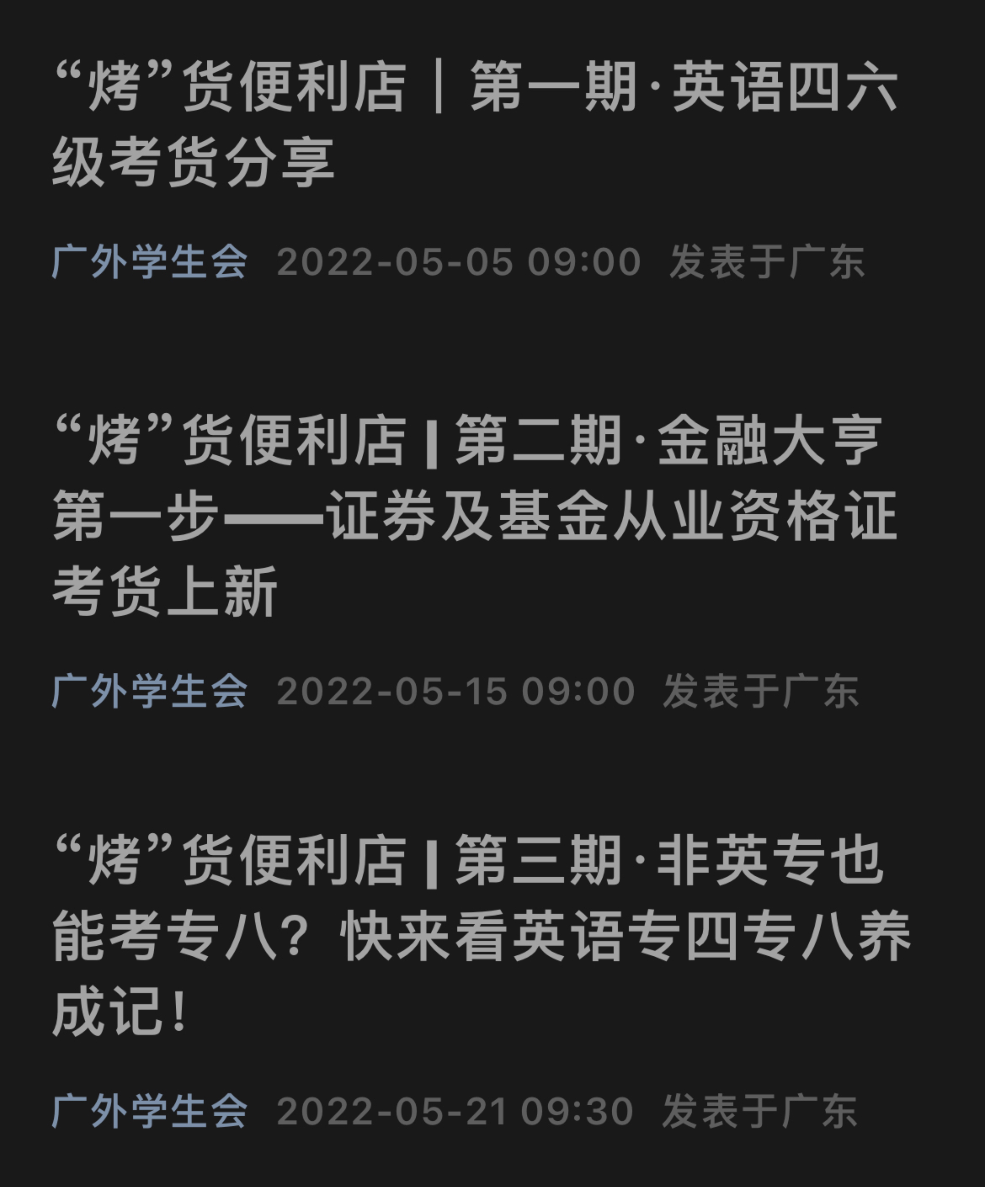 “烤”货便利店,干货满满(学业帮助类) 为帮助广大同学们了解大学各种考试信息,分享师兄师姐总结而出的备考经验和方法、资料等,本支部特别策划了“烤”货便利店系列活动,整理各种考试相关信息并通过推文形式进行发布,为同学们提供极大便利。此外,同学们若有想了解的考试信息,也可以在推文下方进行留言,本支部据此筹备后续的推文。