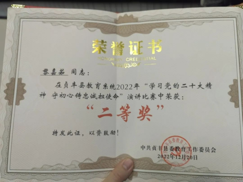 让我比较有成就感的是在党的二十大之际,在广外研支团、贞丰中学的组织学习后,我在周一校会上以入党积极分子、青年支教教师、准硕士研究生的身份进行学习心得的分享,激励学生敢于有梦、敢于吃苦,早日圆梦。以此为基础,我还参加了贞丰县教育系统学习贯彻党的二十大精神演讲比赛,以入党积极分子、在校老师的身份勉励大家成为不忘初心、牢记使命,对党忠诚、不负人民的新时代“四有”好老师,最终收获二等奖的好成绩。