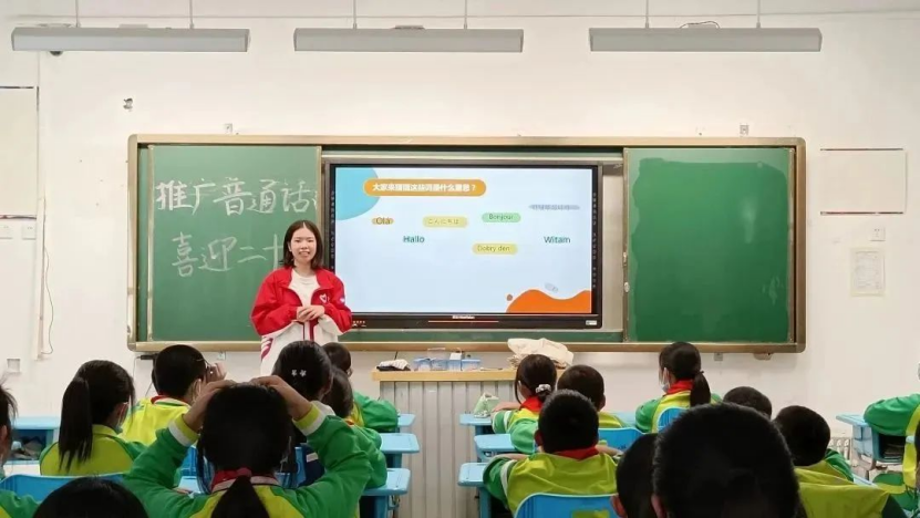 “这些词表达的是‘你好’和‘我喜欢你’。大家看,那么多语言我们都不懂,但只要用普通话来说‘你好’‘我喜欢你’,我们却都能听明白,因为这就是将我们每一个人联系在一起的语言—普通话。”