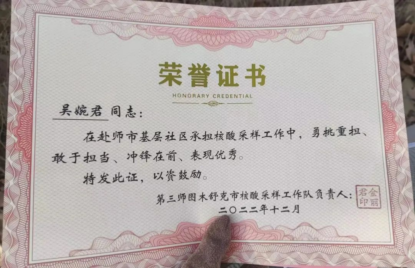 核酸工作结束后,医保局领导授予的奖状