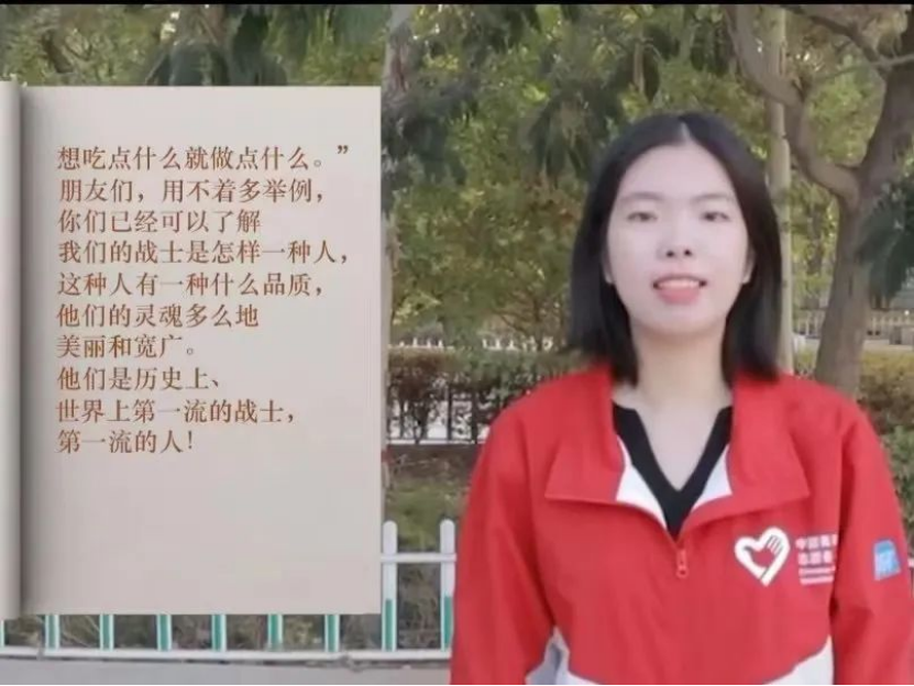 10月份,凉爽的秋风和党的二十大一起来了。在图市一中团委的指导下,我们广外青燕研支团的小伙伴们一起策划了“喜迎二十大·强国我争先”系列活动。我们鼓励各年级的孩子们一起接力朗诵课文《谁是最可爱的人》,选取优秀作品,给予奖励。有着活动策划和评委双重身份的我,在评选作品时,被一位三年级同学的深情朗诵吸引了。突然,脑子里蹦出了一个想法:“不如把优秀作品都挑选出来,制作成一个优质视频,让更多人看到祖国的新一代花朵在朗诵,在感恩,在学习。”在挑选完朗诵作品后,我们研支团的4个人也参与进来,共同完成了《谁是最可爱的人》的朗诵接力。