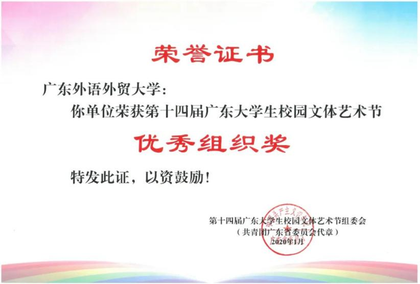 广东大学生校园文体艺术节优秀组织奖